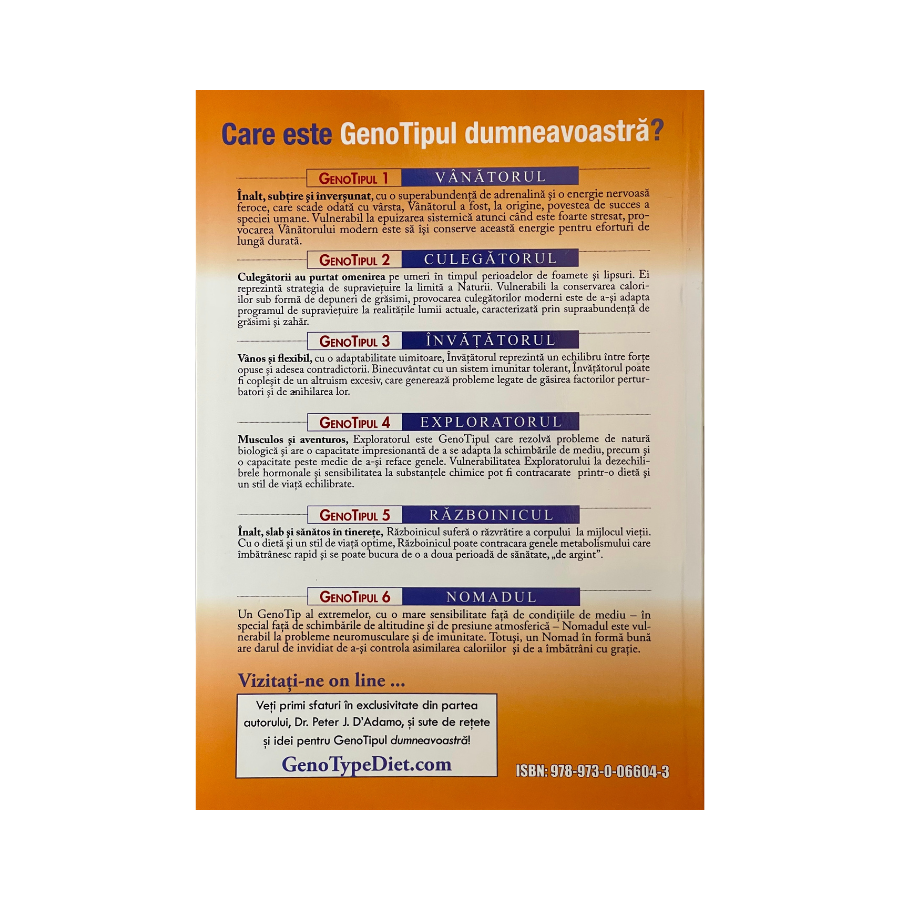 Dr. D'Adamo, renumit pentru cercetarile sale revolutionare, identifica sase geno-tipuri distincte: Vanatorul, Culegatorul, Invatatorul, Exploratorul, Razboinicul si Nomadul. Fiecare dintre aceste tipuri genetice vine cu caracteristici proprii, influentand metabolismul, reactiile la stres si chiar predispozitiile la anumite afectiuni.