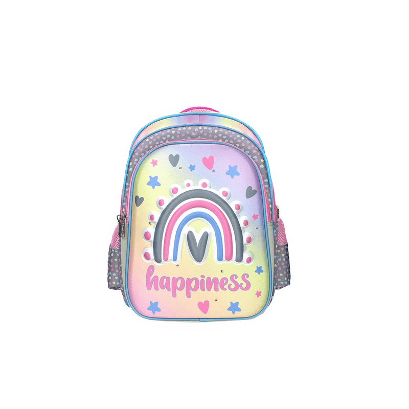 - In partea frontala ghiozdanul are un buzunar realizat din material EVA, cu model HAPPINESS in relief si leduri colorate, ce lumineaza intermitent cateva secunde, cand partea din fata a buzunarului primeste un mic bobarnac. Inchiderea buzunarului se realizeaza cu ajutorul fermoarului.