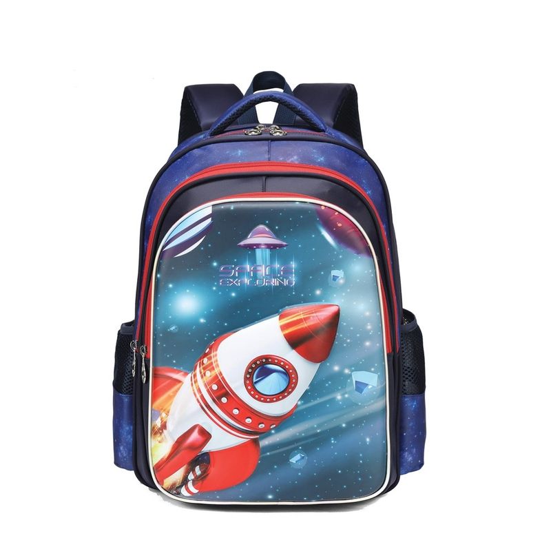 - Produsul este fabricat din poliester 230d. Buzunarul frontal are partea din fata realizata din material EVA 3D cu imprimeu spatial cu racheta, potrivit pentru copii. Partea din spate a ghiozdanului, bretelele si unul din manere sunt buretate. In jurul buzunarului exterior este cusut PVC cu reflexii metalizate.