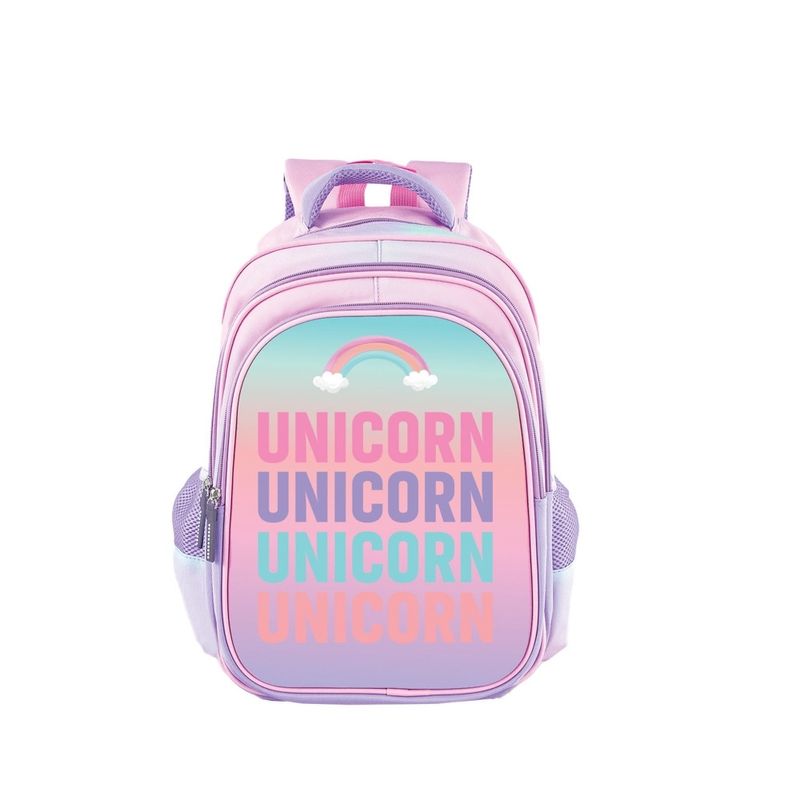 - Acesta are o compartimentare eficienta. Astfel, compartimentul principal ofera un spatiu generos si are un separator cu doua niveluri, prevazut in partea superioara cu banda elastica. Separatorul ajuta la sustinerea rechizitelor in pozitie verticala, in siguranta si, in acelasi timp, cea mai mare greutate ramane in apropierea spatelui, usurand purtarea. Compartimentul secundar este prevazut cu un organizator potrivit pentru asezarea unor obiecte mai mici. Organizatorul este format dintr-un buzunar cu dimensiune de 20x16 cm, peste care sunt suprapuse alte patru buzunare mai mici, unul de 12x12.5 cm, potrivit pentru telefon sau notesuri si alte trei de 2.5x12.5 cm, pentru depozitare instrumente de scris. Buzunarul frontal are carcasa rezistenta, din spuma EVA cu imprimeu 3D Unicorn, articolele transportate in interior fiind protejate de socuri. Inchiderea celor doua compartimente si a buzunarului frontal se realizeaza cu fermoare cu extractoare decorative, compartimentul principal avand dubla tragere.