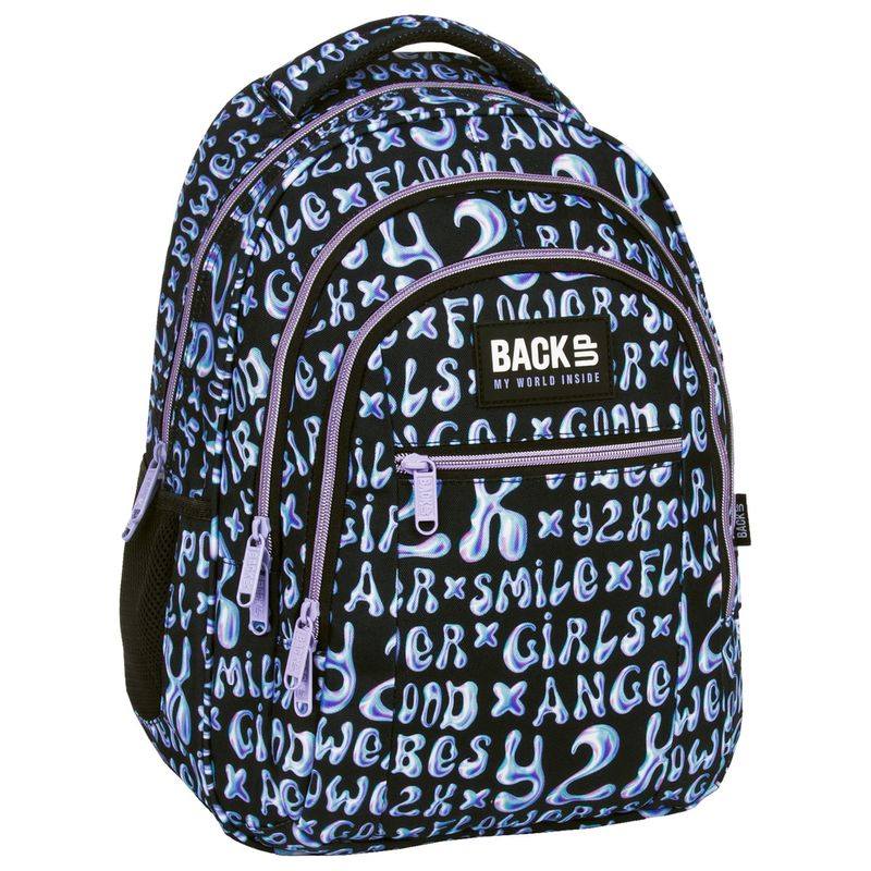 Un rucsac de ?coala pe care orice adolescent �l va iubi. Material negru minimalist, clasic, decorat cu inscrip?ii metalice, motivante, cu efect holo, care adauga energie. Un font extrem de la moda inspirat din stilul Y2K atrage aten?ia celor mai mari creatori de tendin?e. �ntregul este completat cu fermoare ?i fermoare �ntr-o nuan?a eleganta de violet. Acesta este un rucsac pentru o fata care stabile?te tendin?e pe coridorul ?colii.