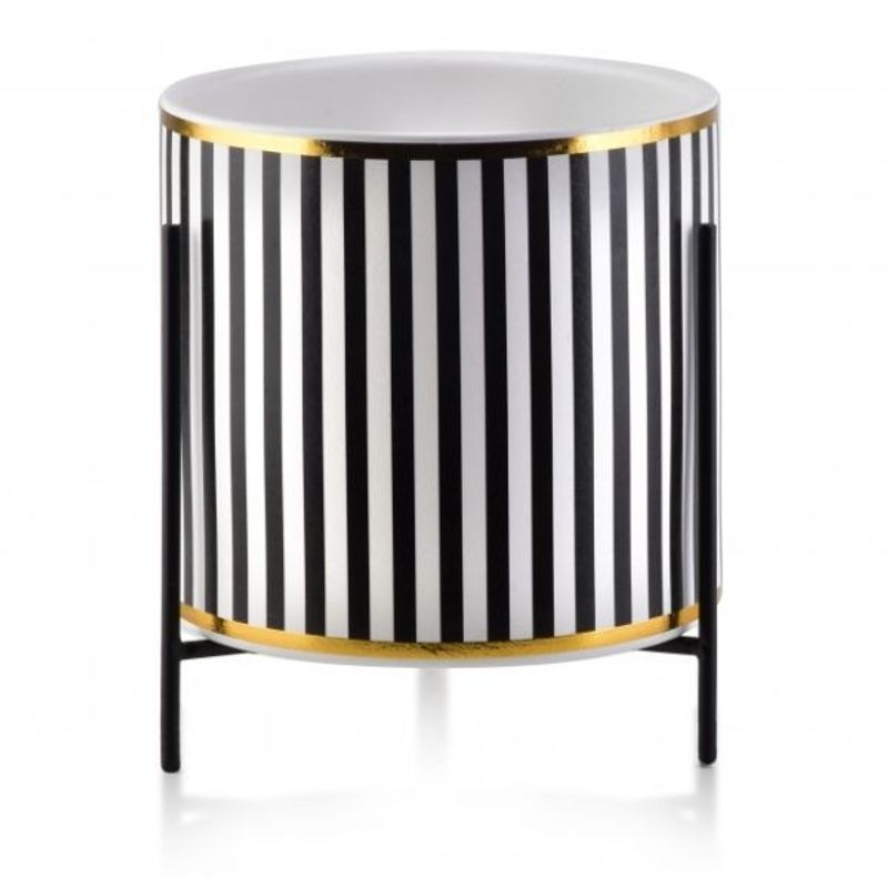 Ghiveci pentru flori Luxury cu suport metalic, 脴 12,5, Inaltime 12 cm, Alb cu Negru, Model cu Dungi Verticale