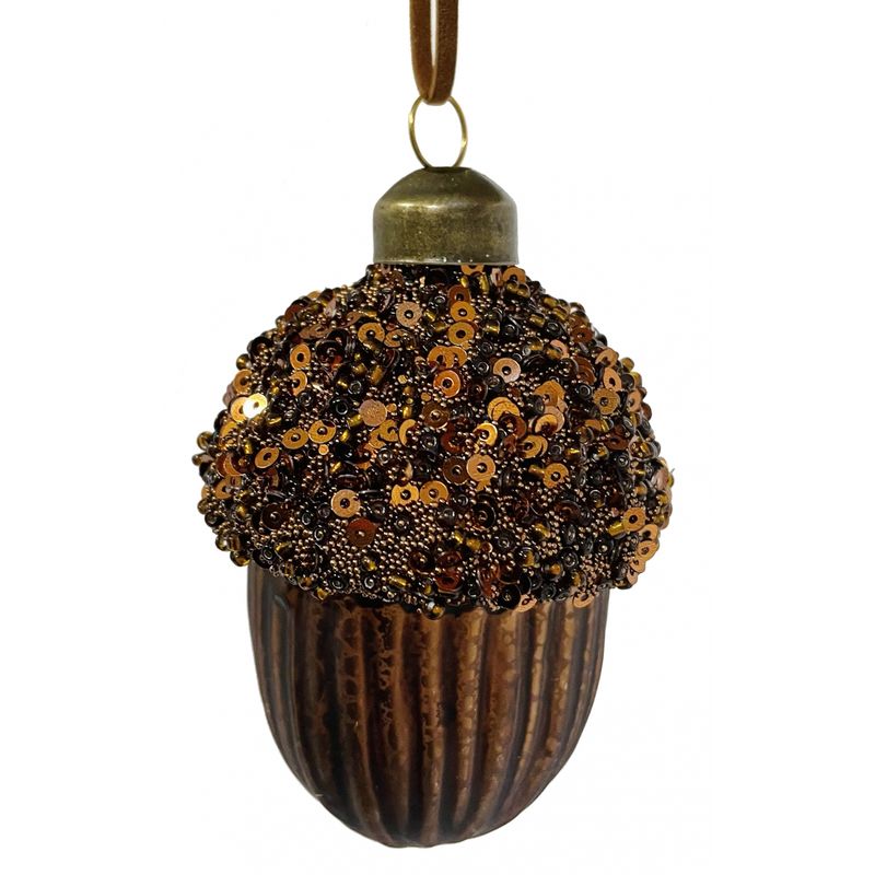 Glob de Craciun model ghinda brad cu paiete, 15 cm, sticla, maro