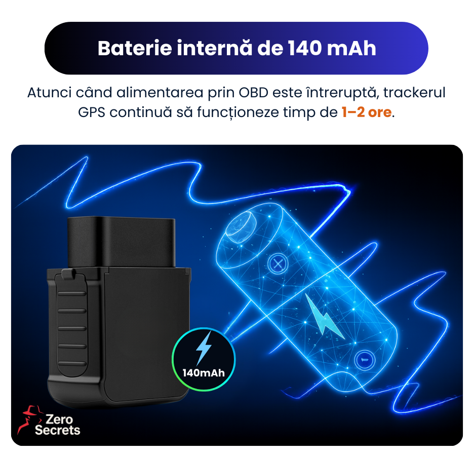 GPS Tracker Auto cu baterie interna de 140 mAh asigura functionarea dispozitivului chiar si atunci cand alimentarea prin portul OBD este intrerupta. In aceste situatii, trackerul continua sa functioneze timp de aproximativ 1–2 ore, oferind un nivel suplimentar de siguranta si continuitate in monitorizare.