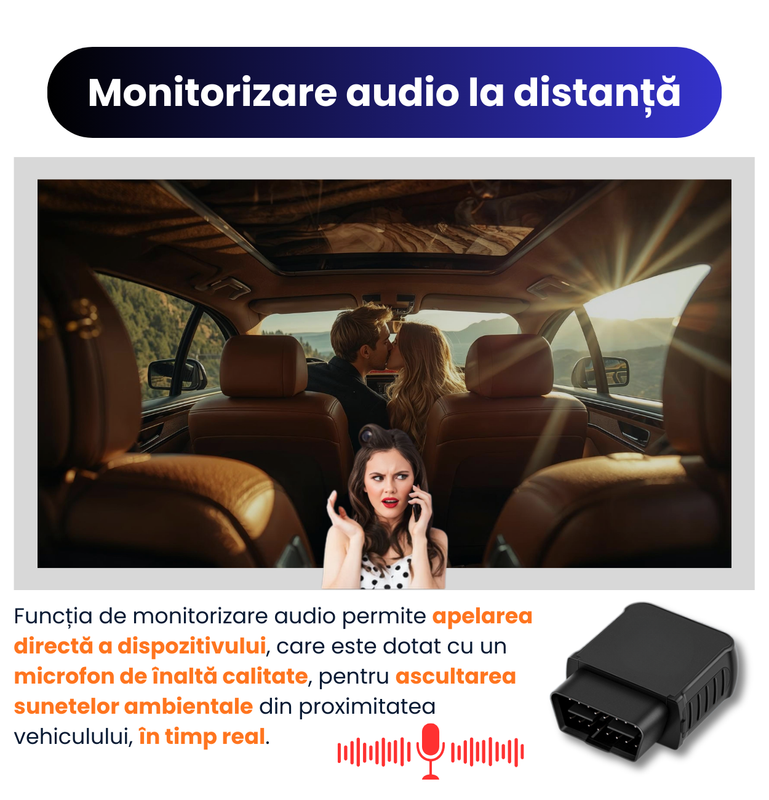 Dispozitivul este echipat cu un microfon de inalta calitate, capabil sa capteze clar sunetele ambientale din proximitatea masinii, oferind un plus de control si siguranta. Aceasta functie este utila pentru verificarea situatiei din interiorul vehiculului, monitorizare discreta sau prevenirea situatiilor neprevazute.