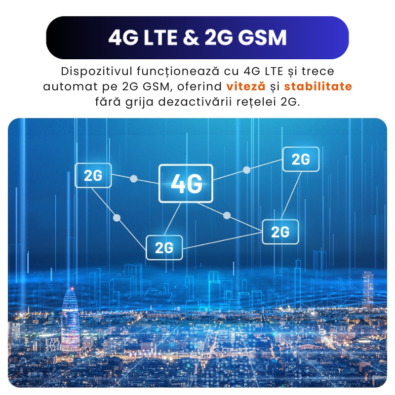 Datorita compatibilitatii 4G LTE si 2G GSM, dispozitivul ramane functional pe termen lung, fara dependenta de o singura retea. Este solutia potrivita pentru siguranta vehiculului, monitorizare flote, utilizare personala sau anti-furt, asigurand transmitere fiabila a datelor in orice conditii de retea.