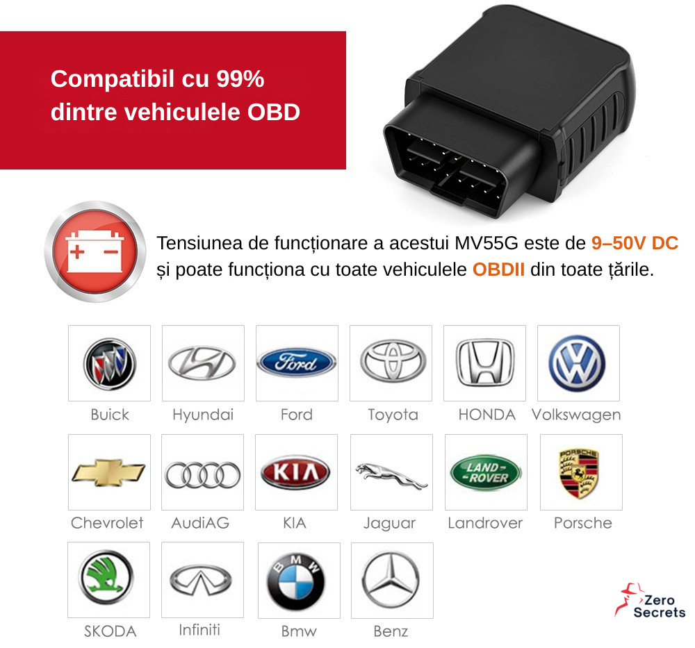 Trackerul functioneaza cu vehicule OBDII din toate tarile, oferind o solutie universala pentru monitorizare auto. Compatibilitatea extinsa permite utilizarea pe majoritatea marcilor populare, inclusiv Volkswagen, BMW, Audi, Mercedes-Benz, Ford, Toyota, Hyundai, Kia, Chevrolet, Skoda, Jaguar, Land Rover, Porsche si multe altele.