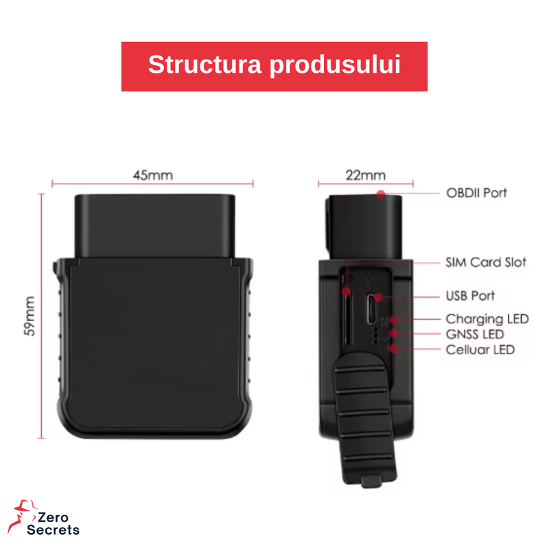 Dimensiunile reduse, de aproximativ 59 mm inaltime, 45 mm latime si 22 mm grosime, permit montarea ascunsa, fara a incomoda spatiul interior. Trackerul este dotat cu slot pentru cartela SIM, port USB si LED-uri de stare pentru alimentare, semnal GNSS si retea celulara, oferind informatii clare despre functionarea dispozitivului.
