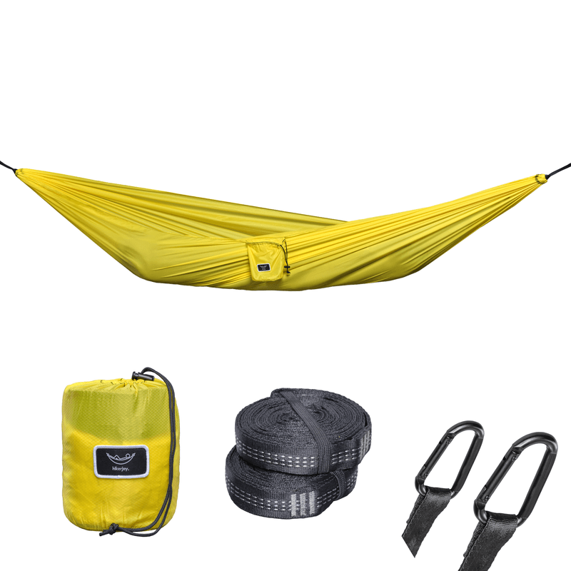 Indiferent daca urcati pe munte, faceti canotaj sau faceti drumetii, hamacul nostru portabil va ofera un cocon confortabil in care sa va intindeti capul la caderea noptii. Ambalabil si usor, hamacul nostru de interior si exterior cantareste doar 400 gr. si se pliaza pentru a incapea in rucsac. Usor de asamblat, iti poti instala hamacul de copac in doar 60 de secunde! Echipat cu curele lungi, 5 bucle si 2 carabine de incredere, pur si simplu suspendati-va hamacul la inaltimea perfecta pentru dvs. Fabricat din nailon premium cu textura rombica 70D,splashproof (nu waterproof) hamacul de calatorie cu o singura calatorie poate sustine pana la 300 de kg. Intarit cu cusaturi de blocare a firului, veti fi in siguranta si confortabil. Un esential pentru camping si cadoul perfect.
