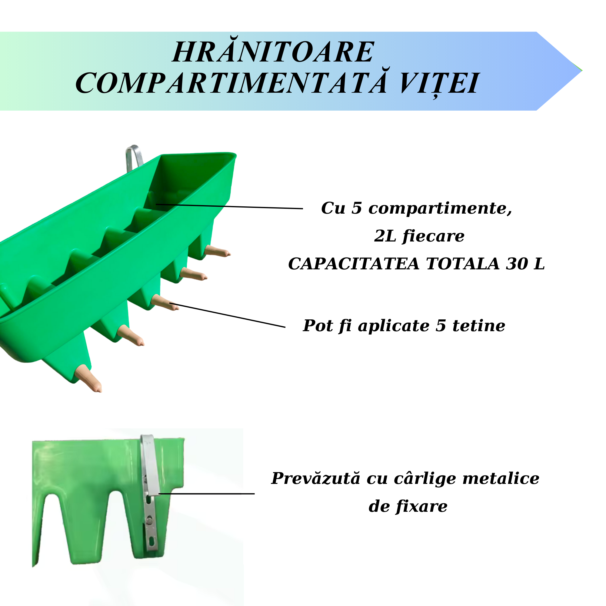 Hranitoarea Compartimentata Vitei, cu 5 Tetine, ABY PRODUCTS este prevazuta cu Carlige Metalice de Fixare si are o capacitate totala de 30 L.