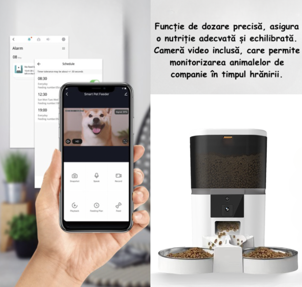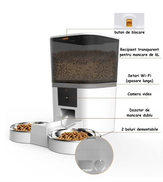 Hranitor dublu automat mancare pentru animale, dozator pentru caini si pisici, camera video inclusa, alb, capacitate 6 l Hranitor dublu automat mancare pentru animale, dozator pentru caini si pisici, camera video inclusa, alb, capacitate 6 l
