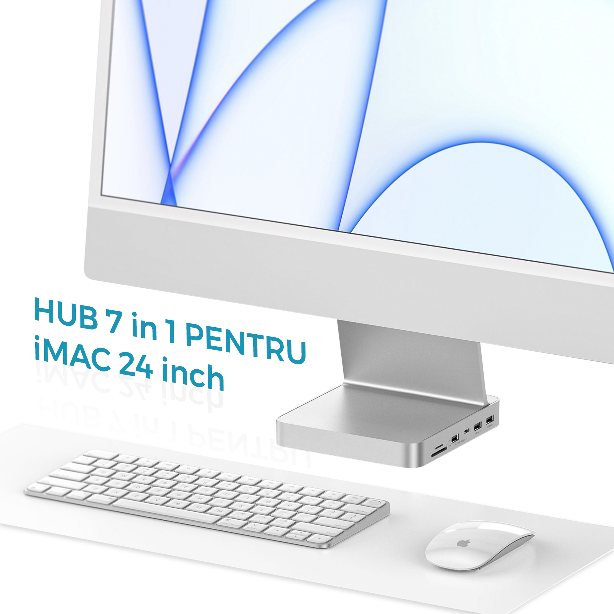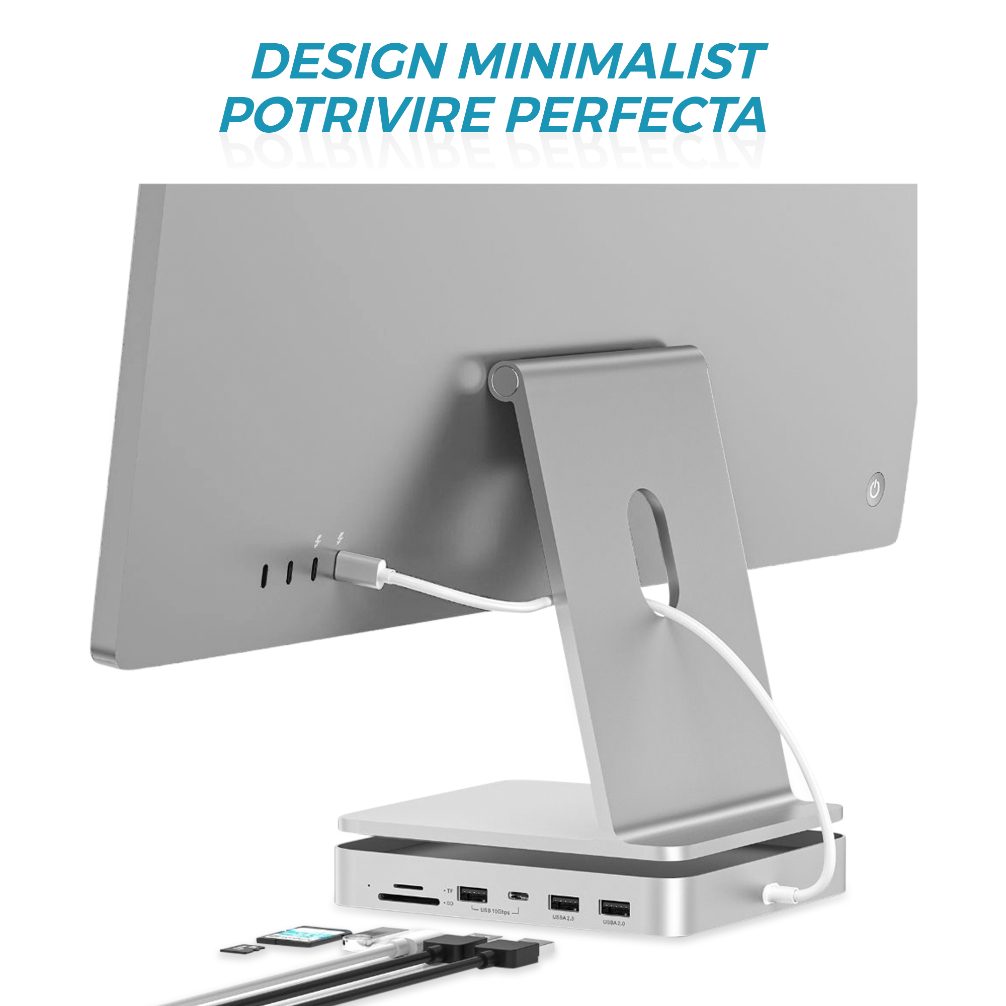 Hub-ul 7 in 1 pentru iMac construit din aluminiu este un dispozitiv versatil care extinde functionalitatea computerului iMac, oferind o varietate de porturi suplimentare pentru a conecta diferite dispozitive si pentru a facilita transferul rapid al datelor.