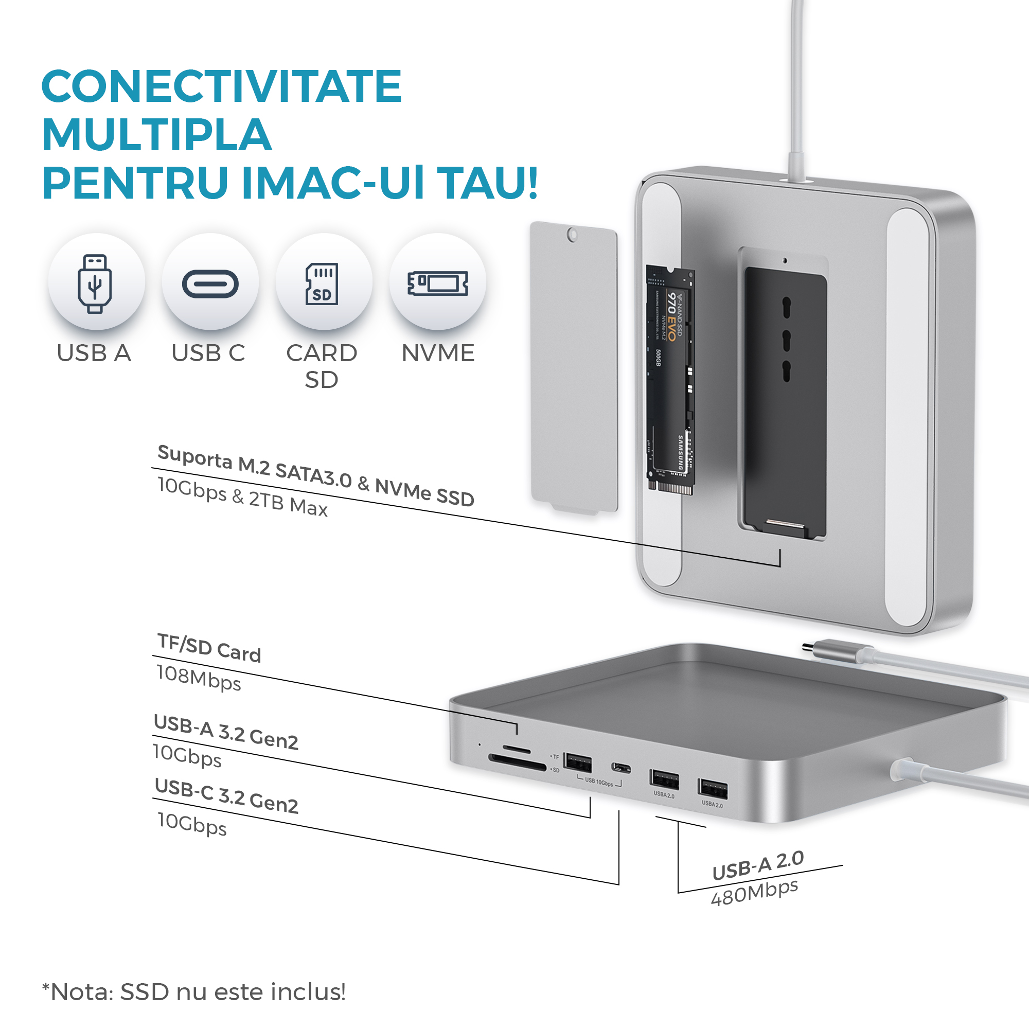 Hub Imac 24 inch Vixev, 7 in 1 Slot M.2 Sata, NVMe SSD, TF, SD, 2x USB A 2.0, 1x USB A 3.2, 1x USB C 10Gbps, Gri Hub Imac 24 inch Vixev, 7 in 1 Slot M.2 Sata, NVMe SSD, TF, SD, 2x USB A 2.0, 1x USB A 3.2, 1x USB C 10Gbps, Gri