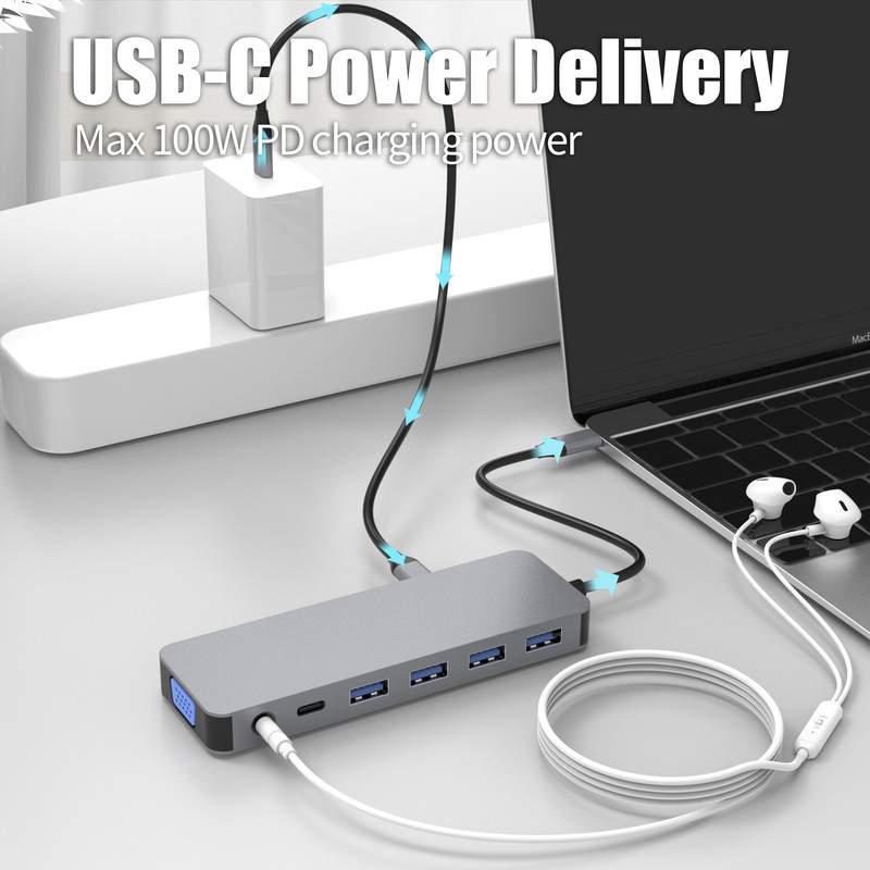 – *PD 100W Charging Port – Dispune de un port USB-C cu incarcare rapida de pana la 100 de wati, permitandu-va sa incarcati laptopul sau dispozitivul in timp ce utilizati celelalte functii ale adaptorului;