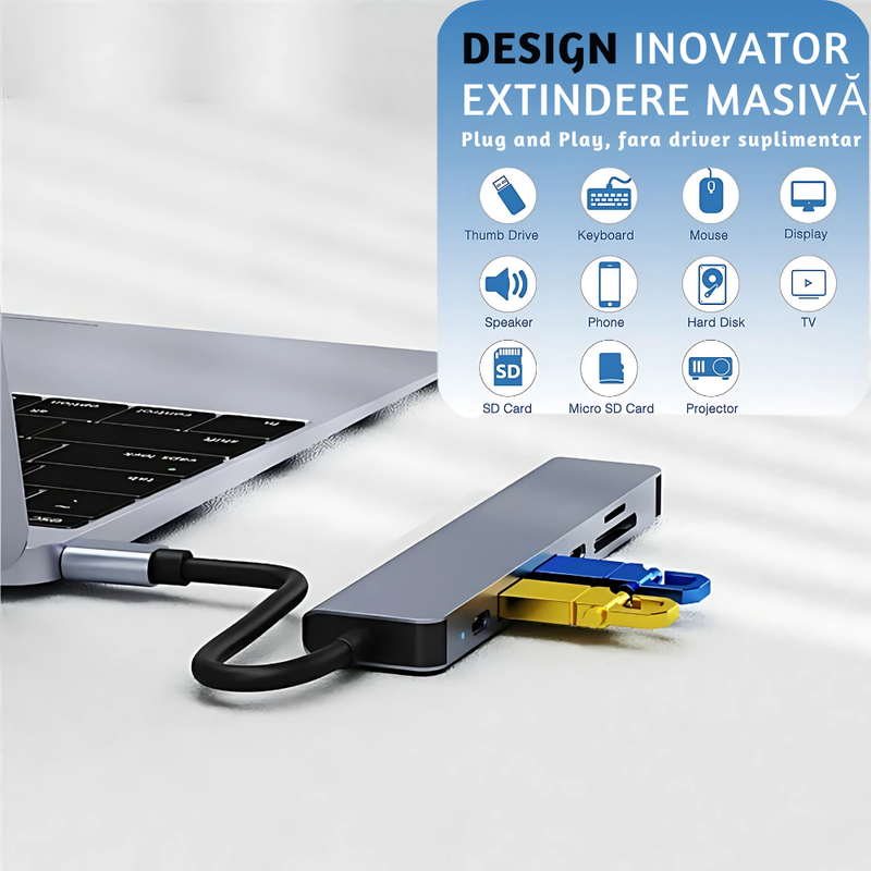 Adaptorul Hub Multiport 7 in 1 LUVLU ofera o solutie completa pentru conectarea dispozitivelor dvs. la diverse accesorii si retele, facandu-l ideal pentru utilizarea acasa, la birou sau in calatorii.