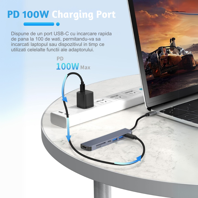 7. *Docking Station Pentru Laptop:* Acest adaptor serveste ca o statie de andocare portabila, transformand laptopul sau tableta dvs. intr-un centru de conectivitate.
