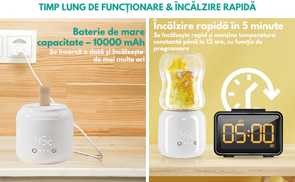 Laptele ajunge la temperatura optima in doar 3-5 minute, ideal pentru momentele de foame brusca ale bebelusului.