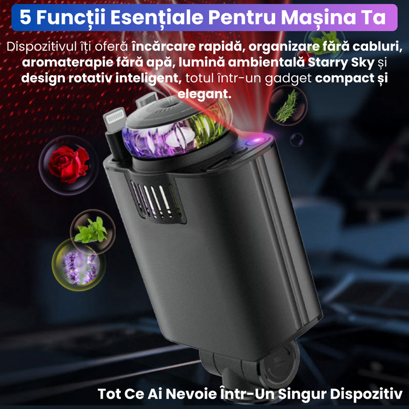 Incarcator Auto 5-in-1 cu Cabluri Retractabile Type-C 45W PD si Lightning, Aromaterapie Fara Apa, Lumina LED Starry Sky Incarcator Auto 5-in-1 cu Cabluri Retractabile Type-C 45W PD si Lightning, Aromaterapie Fara Apa, Lumina LED Starry Sky