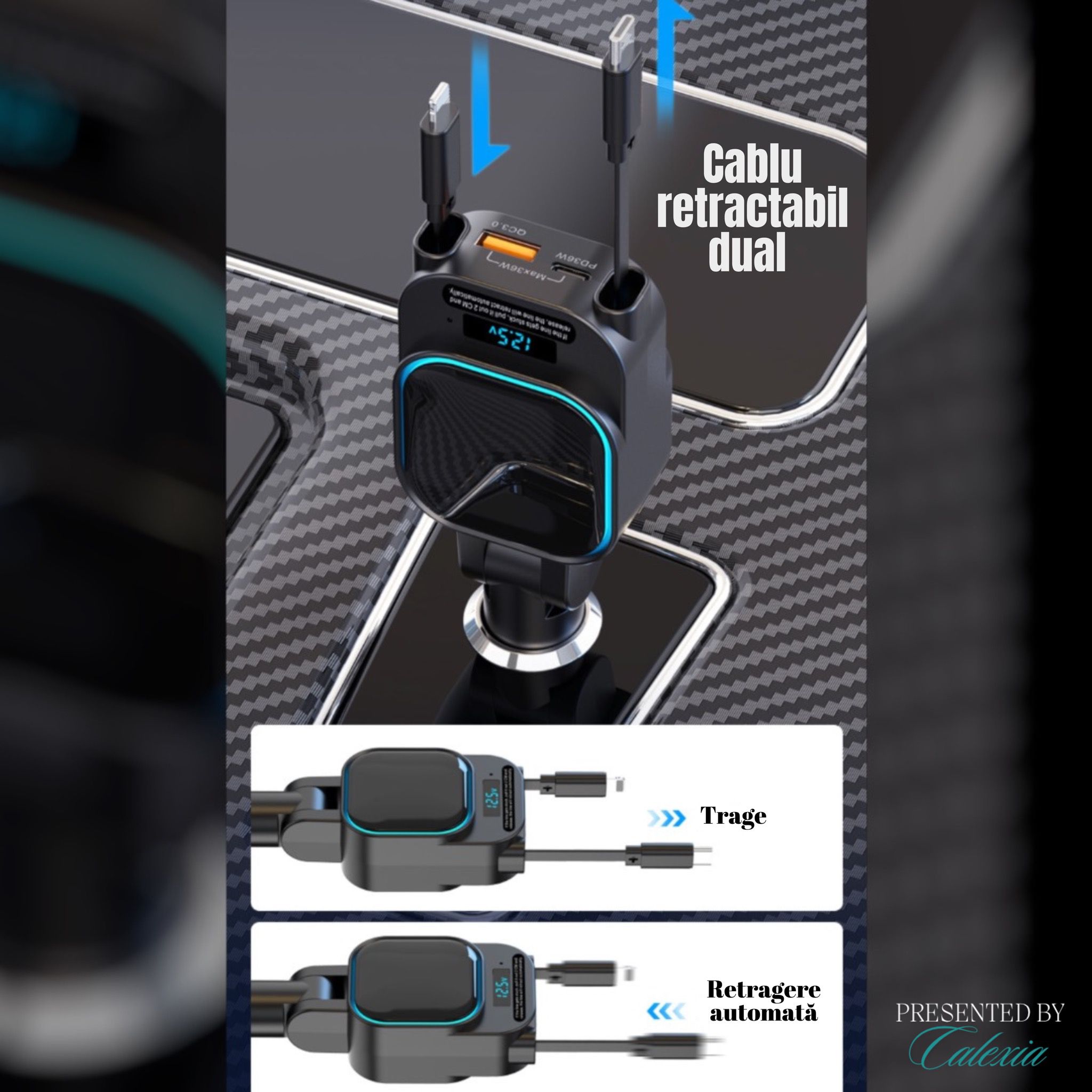 • Cabluri retractabile: Ajustabile pana la 70 cm, integrate pentru porturi Type-C si Lightning.