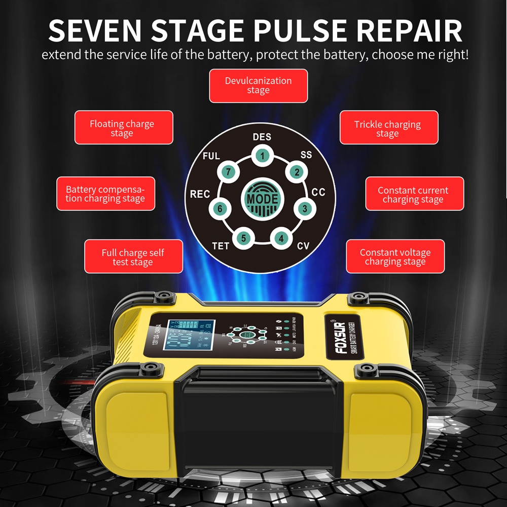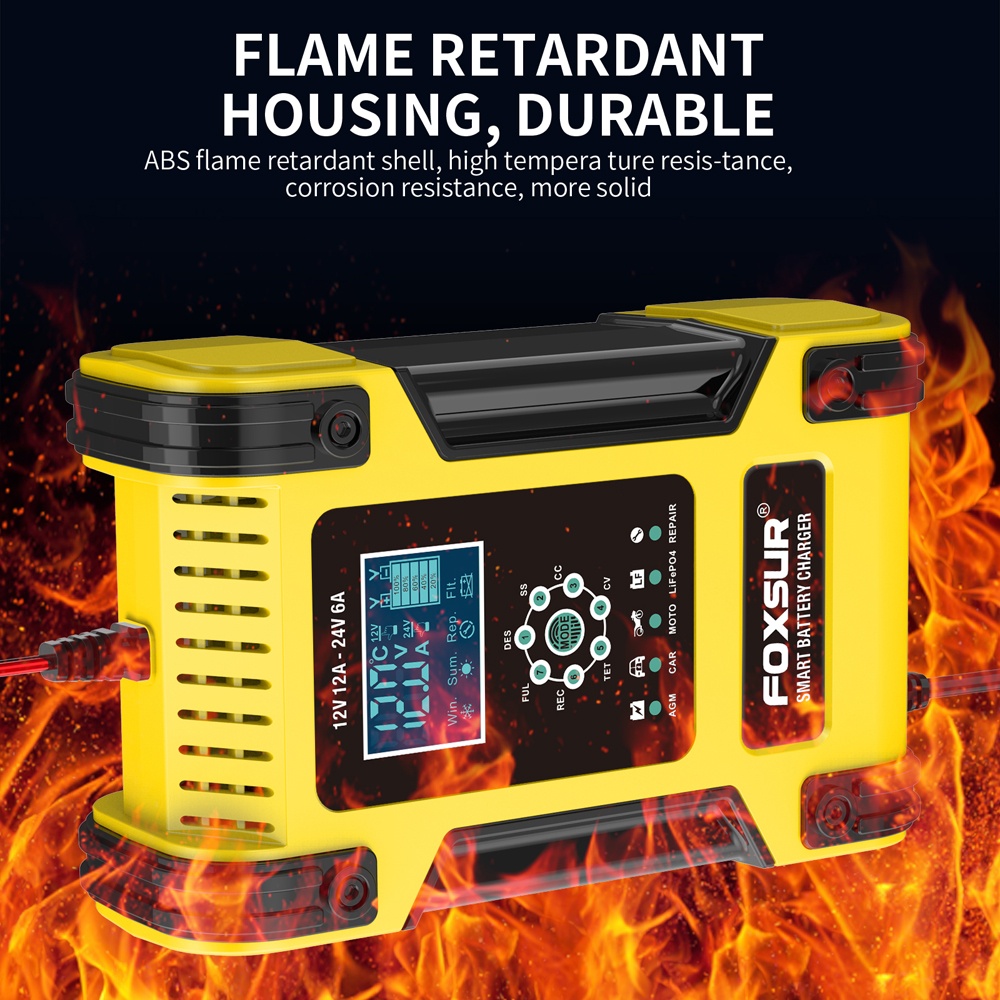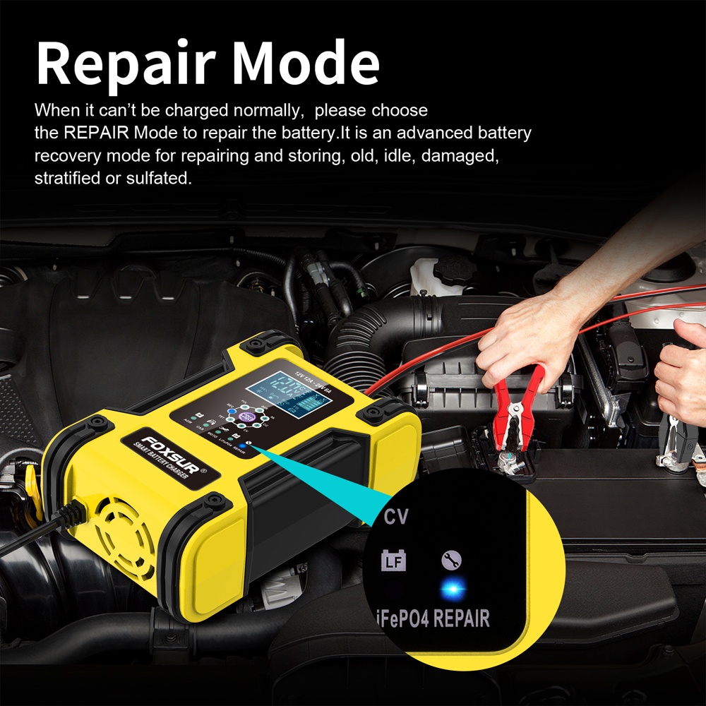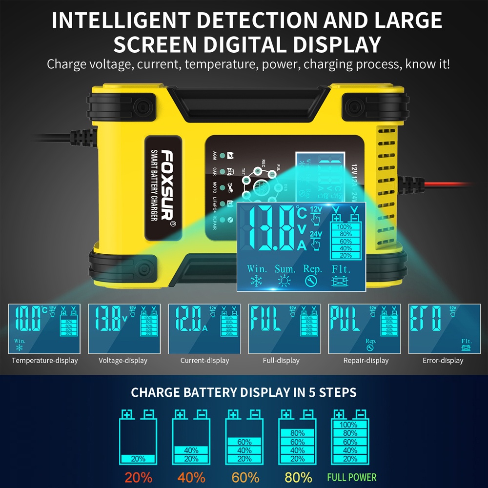 Incarcator auto inteligent FOXSur FBC122412D, 12V 12A / 24V 6A, 7 trepte, Display LCD, Mod Reparatie, AGM, LiFePO4, GEL