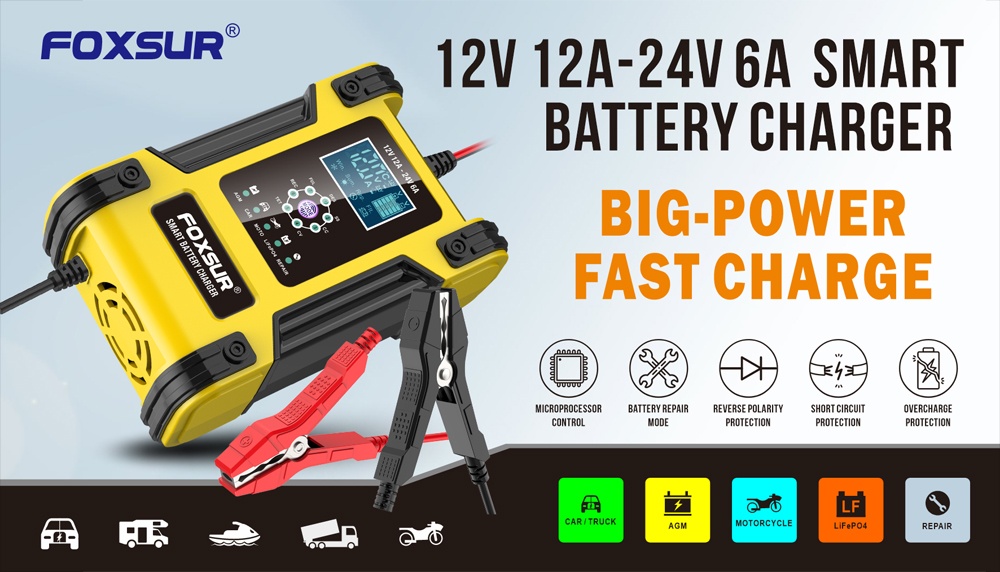 Incarcatorul auto inteligent FOXSur FBC122412D reprezinta solutia completa pentru incarcarea si intretinerea bateriilor auto si moto, fiind compatibil cu baterii pe baza de plumb-acid si LiFePO4 (AGM, GEL, SLA, Wet, Deep Cycle, EFB, Calcium). Este recomandat pentru utilizarea atat la autoturisme, cat si la motociclete si alte vehicule cu baterii de 12V si 24V.