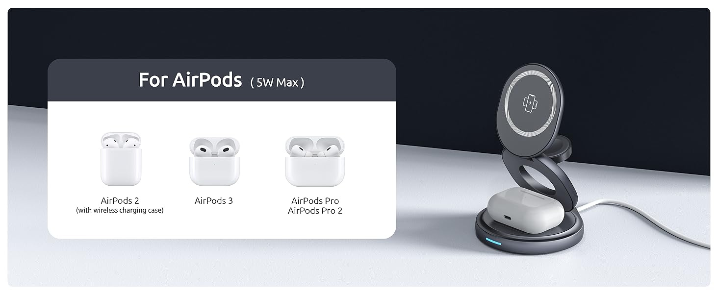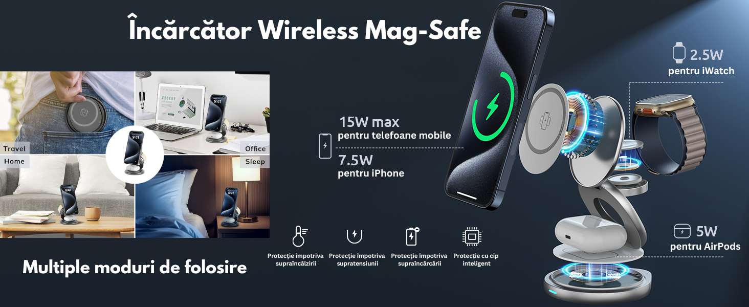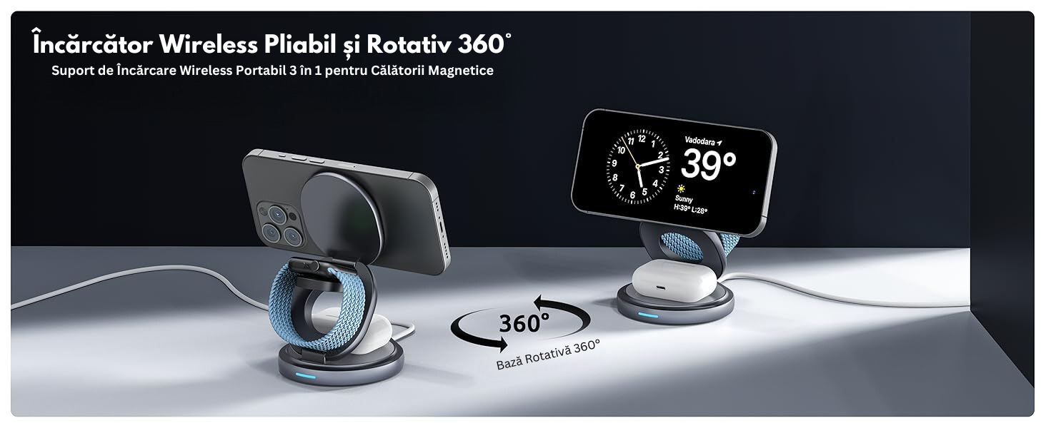 Incarcator magnetic wireless 3 in 1 Pliabil, conceput pentru a incarca doua dispozitive simultan plus ceas Apple Watch. Datorita celor doua imbinari, puteti ajusta unghiul si pozitia in functie de nevoile dumneavoastra. Mentineti biroul ordonat, lipsit de cabluri inutile! Produsul este compatibil MagSafe.