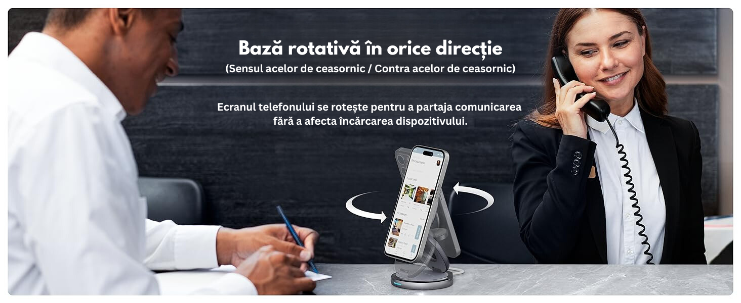 Reglati suportul in functie de unghiul potrivit. Este o optiune de incarcare foarte buna atunci cand este plasata in dormitor, pe birou sau langa computer.Suporta rotatie de 360° pentru a tine iPhone-ul in orice directie, in functie de necesitate.