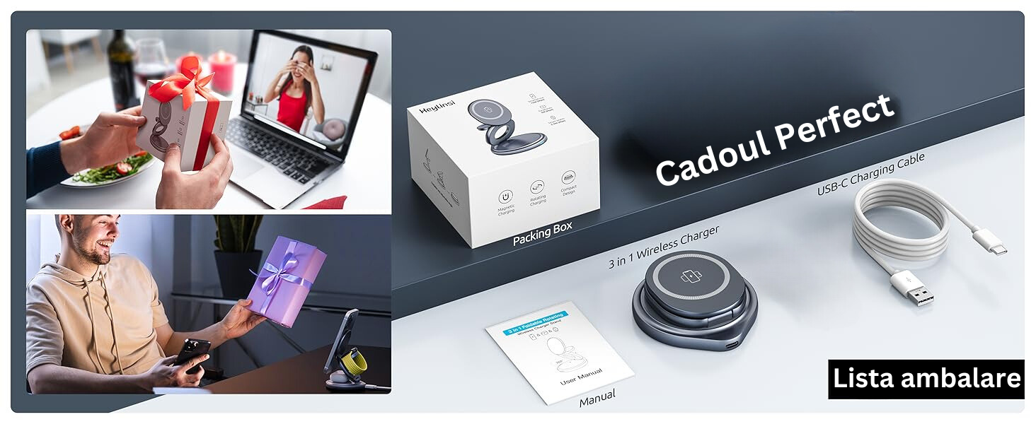 Suportul pliabil pentru incarcator fara fir 3 in 1 ofera o modalitate eleganta si eficienta de a va incarca dispozitivele. Cu designul sau pliabil, acest incarcator poate gazdui simultan smartphone-ul, ceasul inteligent si castile, economisind timp si dezordine. Bucurati-va de confortul incarcarii fara fir cu acest suport versatil.