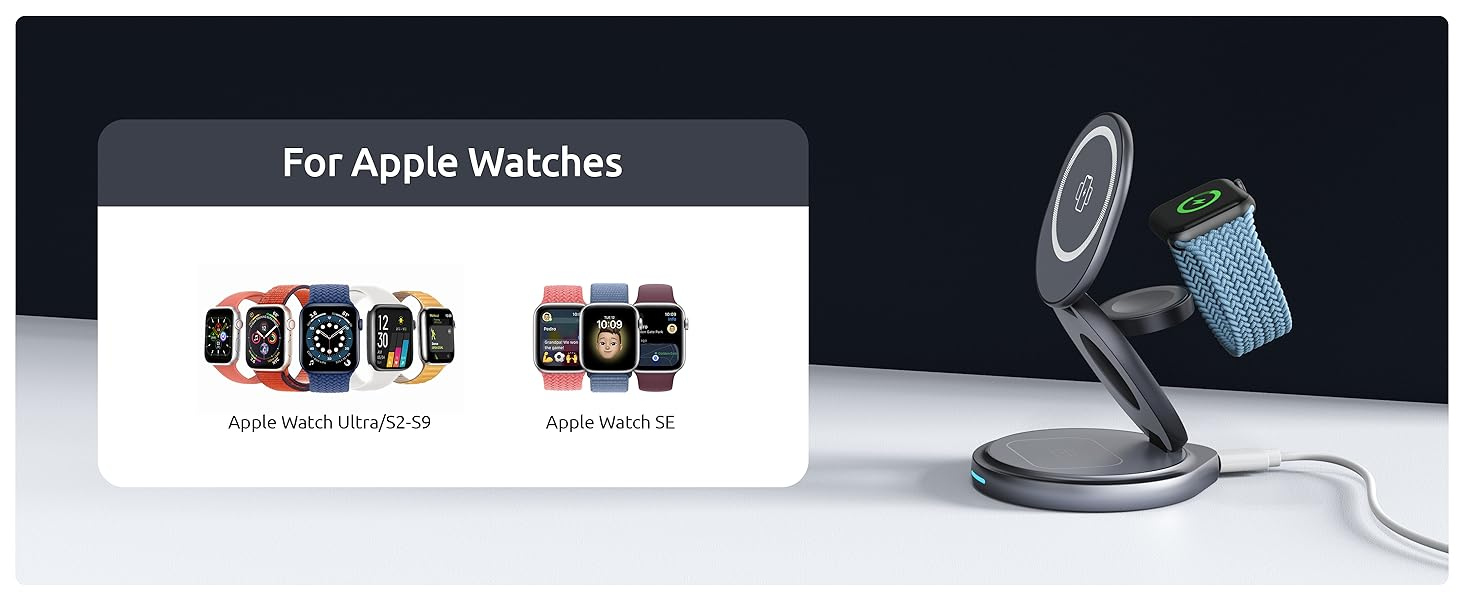 Incarcatorul suporta incarcarea rapida pentru Apple Watch de generatia 7, 8 si 9, precum si Apple Watch Ultra de generatia 1si 2. Incarcatorul pliabil va incarca ceasul Apple Watch in mod convenabil, compatibil cu toate tipurile de bratari.