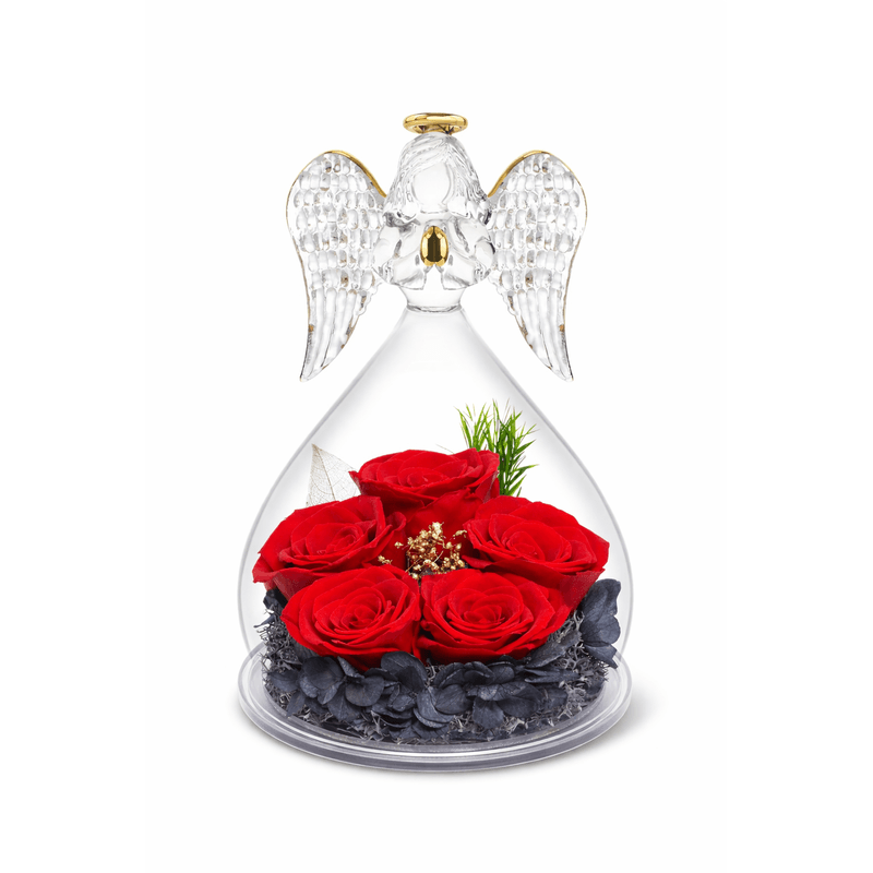 Un cadou deosebit, care imbina frumusetea delicata a florilor naturale conservate cu rafinamentul unui inger din sticla, creat pentru a transmite emotie, iubire si recunostinta.