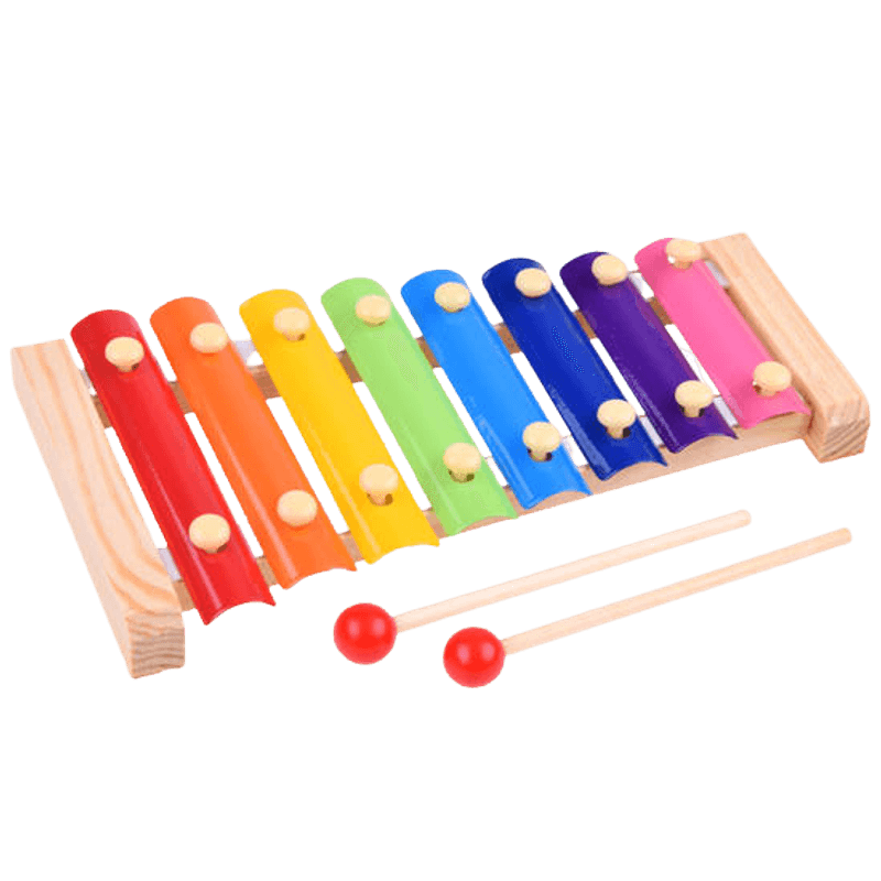 Xilofonul este un instrument de percutie confectionat din 8 placi colorate diferit, avand 8 sunete diferite care ii vor permite copilului sa cante melodii simple. Ajuta la recunoasterea sunetelor si are un efect pozitiv asupra simtului ritmului. Culorile vii si calde vor incuraja copilul sa se joace. Jucaria va fi, de asemenea, potrivita pentru cand va invata culorile.