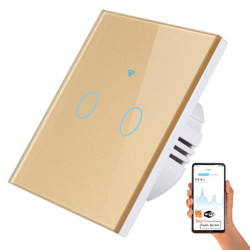 Intrerupator inteligent cu touch, Wireless, VisionHub®, Wi-fi, 2 Canale, Sticla Securizata, Compatibil iOS/Android, Tuya, Amazon Alexa/Google Assistant, Auriu.