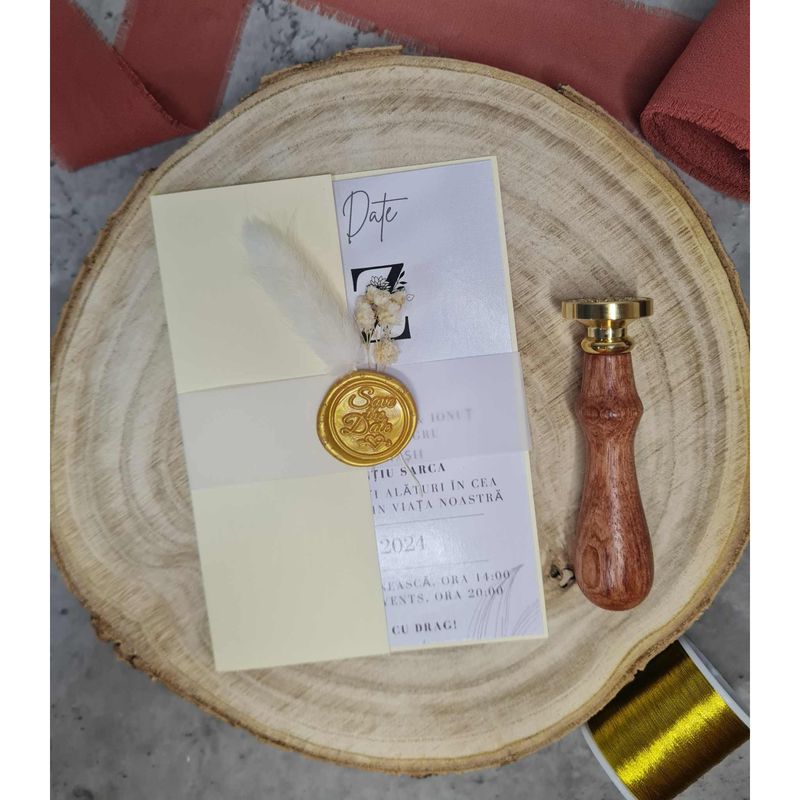 Invitatie de Nunta cu flori uscate si sigiliu auriu "Save the date" Invitatie de Nunta cu flori uscate si sigiliu auriu "Save the date"