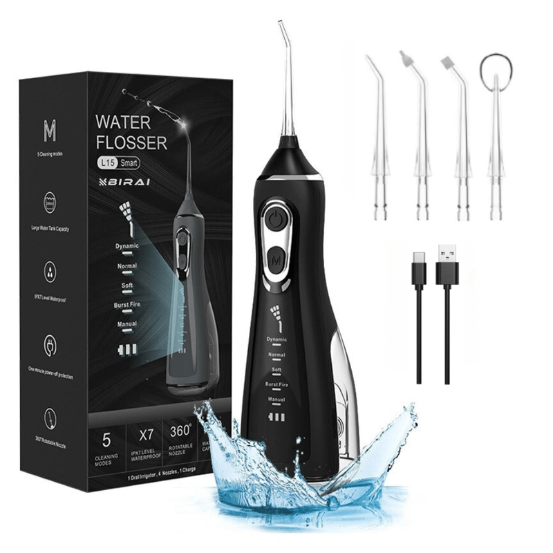 Irigator Oral Profesional BIRAI® pentru Dus Bucal fara fir, Portabil, Water Flosser L15 Smart, Curatare Eficienta a Dintilor, 5 Programe de lucru, 1800 Pulsatii/min, IPX7 Impermeabil, Rotatie 360 Grade, 4 Capete, Baterie 2000mAh, Revervor 300 ml, Negru