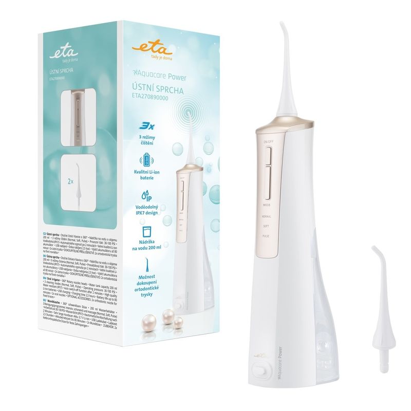 Modul selectat poate fi schimbat cu usurinta chiar in timpul curatarii. Irigatorul bucal este astfel un mijloc ideal pentru igiena zilnica, dar si pentru curatarea implanturilor dentare, a aparatelor dentare fixe, puntilor si coroanelor. Rezervorul de apa are un volum de 200 ml. Dusul bucal are o rezistenta la contactul cu apa conform standardului IPX7, astfel ca mediul umed din baie sau jetul de apa nu reprezinta o problema.