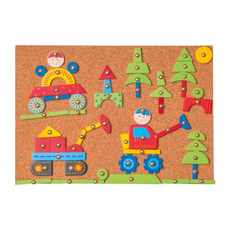 Joc de constructie Woodyland Tabla de pluta cu pioneze si ciocan Joc de constructie Woodyland Tabla de pluta cu pioneze si ciocan