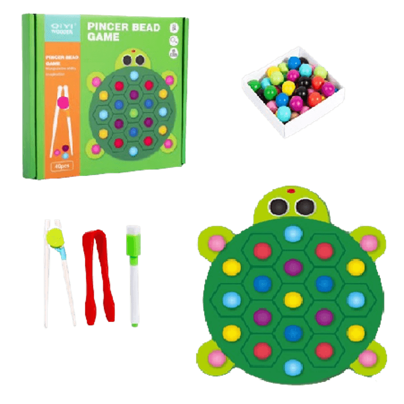 Aceasta jucarie stimuleaza abilitatile analitice si de rationament, functiile motorii fine ale copiilor, puterea de observare, concentrarea, rabdarea si ajuta la invatarea de catre prescolari a operatiilor de sortare si grupare. Pozitionati bilele colorate, respectand culoarea, in spatiile perforate din interiorul sablonului. Impactul educational puternic al jucariilor Montessori nu mai este un secret pentru nimeni, iar acest joc cu bile nu numai ca ajuta la imbunatatirea indemanarii, ci si la familiarizarea copilului cu diferite concepte practice, cum ar fi sortarea, asocierea, utilizarea pensetei. Acest joc de bile este realizat din lemn puternic si rezistent. Este lustruit manual si acoperit cu vopsea pe baza de apa pentru a o face neteda, fara bavuri. Indemnati copilul sa numere si sa sorteze bilele colorate, o modalitate distractiva de a incepe dezvoltarea timpurie a STEM si de a imbunatati abilitatile de recunoastere a culorilor. Jocul de indemanare Montessori include: 1 placa de baza cu 2 fete 1 penseta 2 betisoare 1 marker cu burete de stergere 40 bile colorate Cutie de depozitare Caracteristici Dezvoltarea abilitatilor : prin recunoasterea culorilor si a formelor, prin dezvoltarea observatiei si a logicii, folosind coordonarea ochi-mana, puterea mainii si exersand tinerea betisoarelor. Materiale din lemn : Aceasta jucarie durabila rezista la uzura, ceea ce o face un instrument de lunga durata pentru imbunatatirea coordonarii ochi-mana si a dezvoltarii cognitive. Forma vibranta de desene animate : jocul este conceput cu forme atractive de animale si culori vibrante care atrag instantaneu atentia copiilor. Simplu de jucat : Partea din spate a placii poate fi desenata si asortata cu culoarea prin prindere cu clips, adaugand mai multe provocari distractive si creative pentru timpul de joaca. Beneficii : Invatare Prin Joaca : Copiii invata sa sorteze bilele si sa isi exerseze tinerea betisoarelor, dezvoltandu-si in acelasi timp gandirea logica, abilitatile de rezolvare a problemelor si functiile motorii. Interactivitate : Ideala pentru sesiuni de joaca individuala sau in grup, in familie sau in medii educationale. Stimulare Vizuala si Tactila : Culorile vibrante si texturile placute ale lemnului stimuleaza simturile copilului si mentin interesul acestuia. Ofera-i copilului oportunitatea de a-si dezvolta abilitatile esentiale in timp ce se distreaza. „ Lasa copilul sa fie actorul, copilul va conduce.” - Maria Montessori Specificatii Material : Lemn Varsta : 3 ani+ Dimensiuni tabla de joc: 17.8 cm inaltime Dimensiuni ambalaj: 20 x 19 x 3 cm