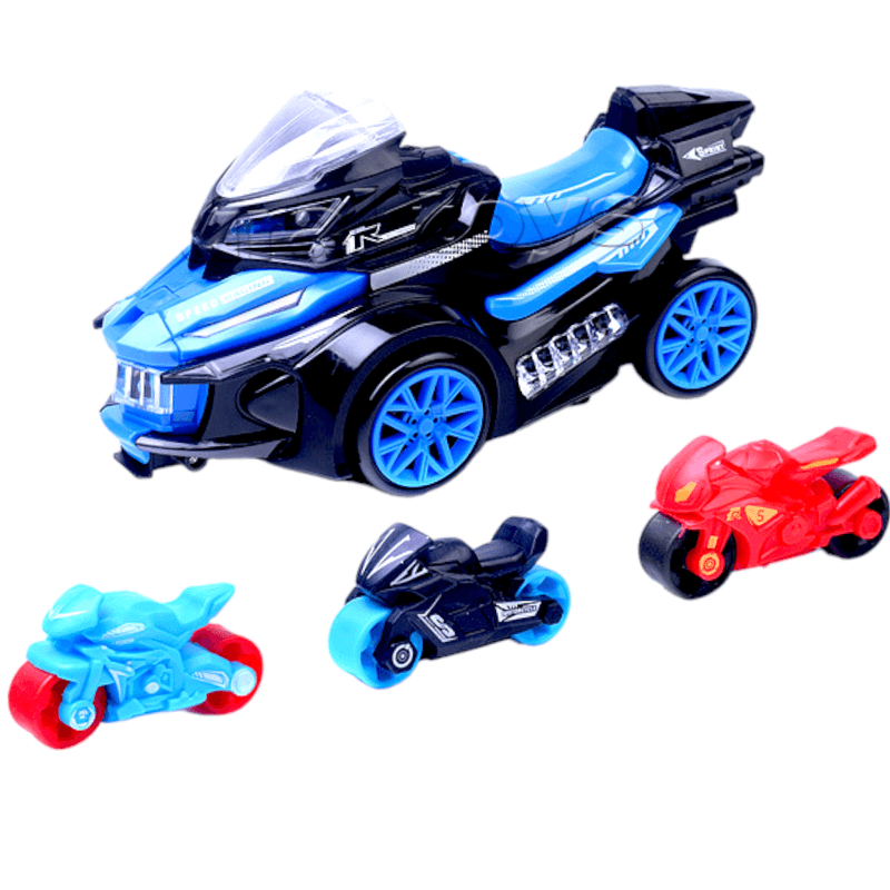 Jucaria motocicleta kidsNplay este perfecta pentru a stimula imaginatia si creativitatea copiilor. Aceasta jucarie captivanta vine cu lansatoare pentru 3 mini motociclete ce pot fi trase in viteza, oferind entertainment nelimitat. Motocicleta este fabricata din plastic rezistent, fiind potrivita pentru copii de 3 ani sau mai mari. Cu dimensiunile sale compacte de 22x10x11 cm, jucaria este usor de manevrat si poate fi luata oriunde cu copilul.Dimensiunea celor 3 mini motociclete lansate - 4x1,5x2 cmCu efectele sonore si luminoase, motocicleta kidsNplay aduce un plus de divertisment. Copilul se va bucura de sunete realiste si luminos colorate care vor anima joaca luiAdauga aceasta jucarie motocicleta kidsNplay in cosul de cumparaturi si ofera-i copilului tau o experienta de joc captivanta si plina de distractiv!Pachetul contine cele 3 baterii 1,5V, necesare alimentarii