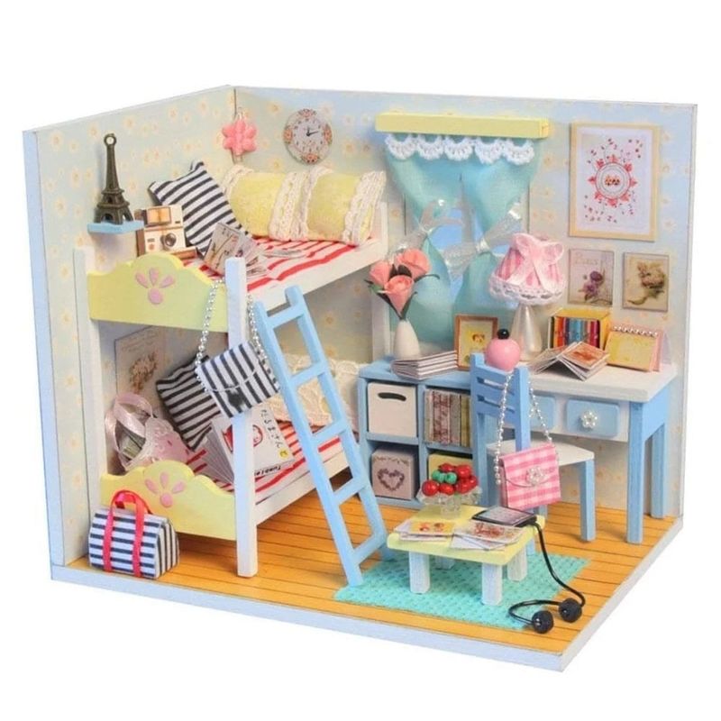 Kitul Casuta DIY in Miniatura cu Pat Supraetajat, Multicolor - Set Complet cu Mobilier si Accesorii este un proiect de asamblare detaliat si captivant, perfect pentru cei pasionati de modelism si decoratiuni interioare. Acest set ofera oportunitatea de a construi si personaliza o casuta in miniatura plina de culoare si stil, echipata cu mobilier si accesorii atent detaliate.