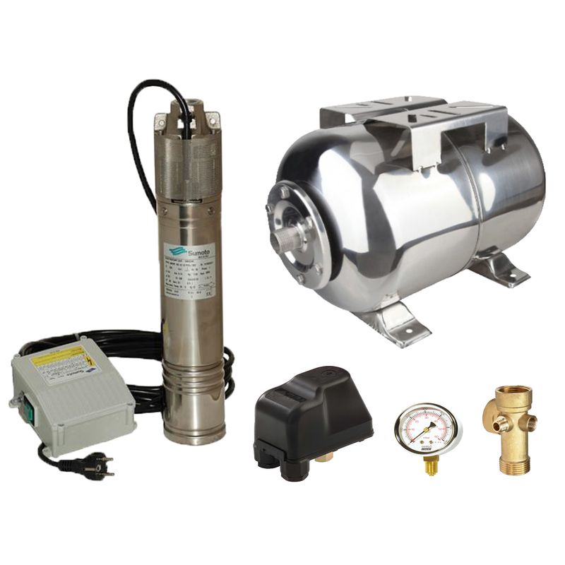 Kit complet sistem hidrofor, pompa submersibila apa curata SUMOTO SM0071/50I, rezervor de 50 litri din inox, presostat, racord 5 cai, manometru Kit complet sistem hidrofor, pompa submersibila apa curata SUMOTO SM0071/50I, rezervor de 50 litri din inox, presostat, racord 5 cai, manometru