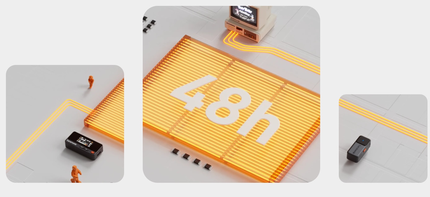 Microfonul functioneaza pana la 10 ore, iar receptorul pana la 6,5 ore (cu ecranul pornit) si suporta incarcarea in timpul utilizarii. Carcasa reincarca toate cele trei unitati 1,5× pentru o utilizare totala de pana la 48 de ore, cu LED-uri care arata nivelul bateriei dintr-o privire. Putere care tine pasul cu livestream-urile, vlog-urile si multe altele.