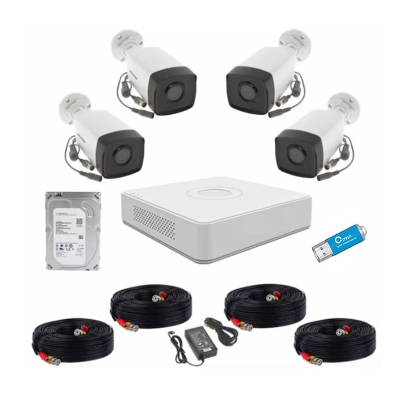 Casa si GradinaElectriceSmart HomeCamere de supraveghereKit supraveghere Hikvision 4 camere de exterior 2MP, IR 40m, IP67, DVR 4 canale, accesorii montaj, HDD, stick Ovio