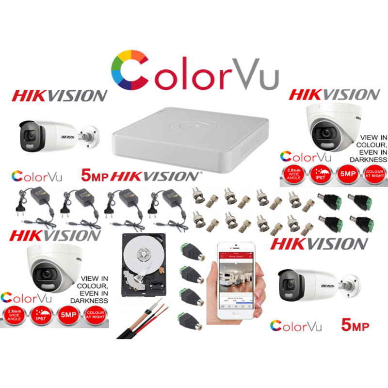 Sistem supraveghere profesional cu 4 camere profesionale Hikvision Color Vu ( color full time ) 2 exterior si 2 interior, accesoriile de care aveti nevoie sunt incluse in acest pachet (A cablu, mufe, surse alimentare ).