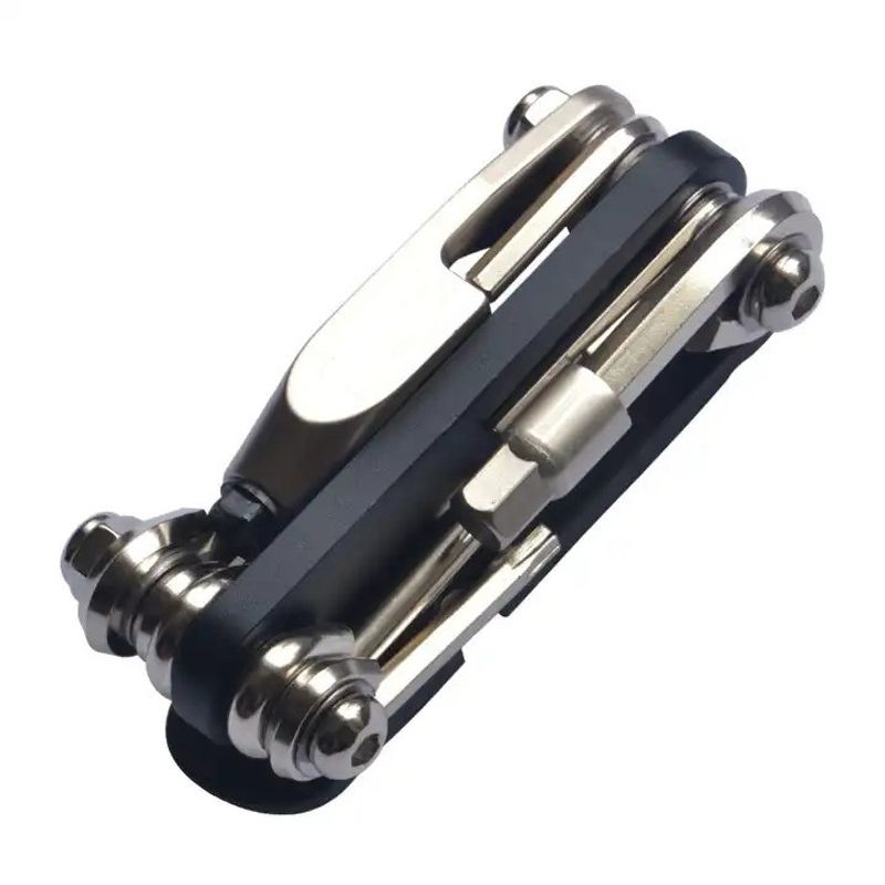 Acest kit multifunctional ofera o gama larga de unelte, fiecare fiind conceputa special pentru a face fata diferitelor probleme pe care le poti intalni in timpul calatoriilor tale pe bicicleta. Printre cele 16 functii se numara chei hexagonale de diferite dimensiuni, surubelnite plate si crucisatoare, chei pentru spite si alte unelte esentiale pentru ajustarea si reparatia bicicletei.