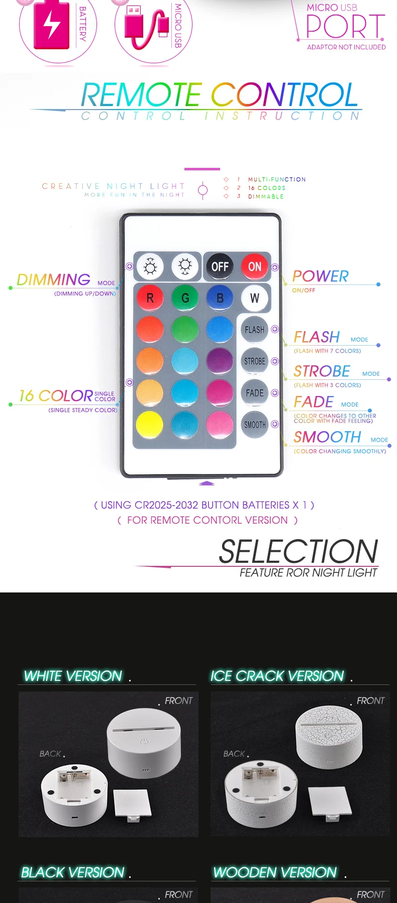 Lampa De Veghe 3D LED, Masina, 16 Culori, schimbare culoare prin telecomanda, Lumina Ambientala, Alimentare USB cu Incarcator priza si/sau 3 baterii AA.