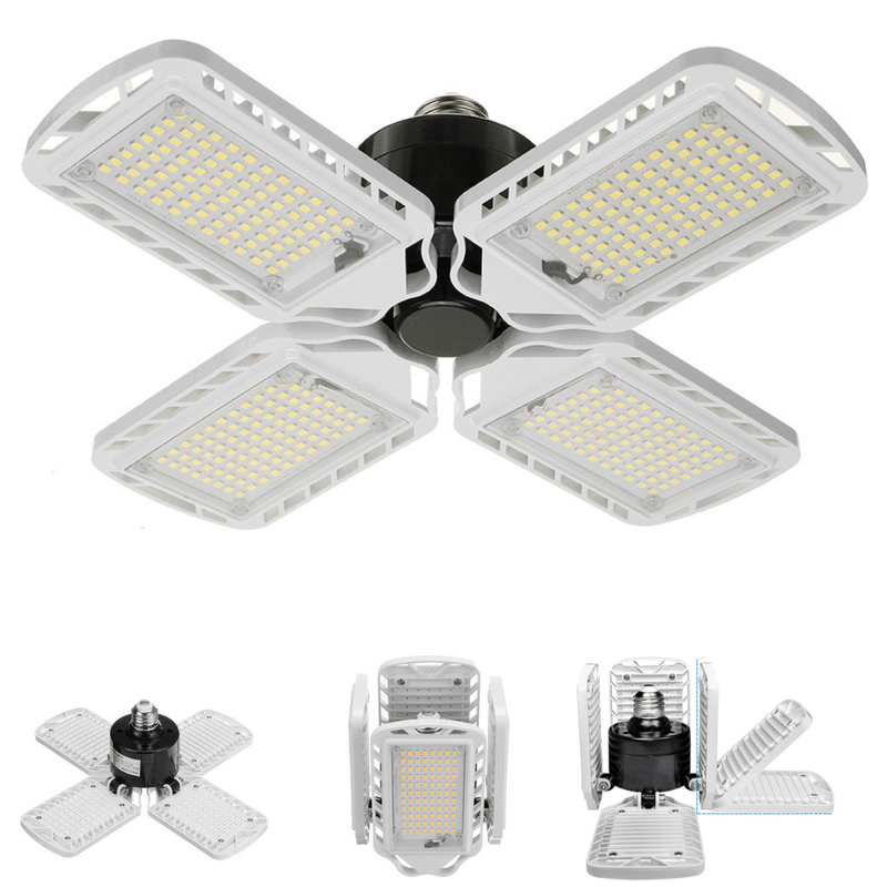 Lumini de garaj cu LED-uri de inalta luminozitate: Noua lumina de garaj cu 4 brate, de 60W, este echipata cu cipuri LED de inalta calitate si ofera o cantitate uimitoare de lumina (352 de becuri LED). Materialul este sigur si rezistent la rupere, nu contine mercur si este prietenos cu mediul inconjurator. Emite o lumina moale, in culoarea lumina rece de 6500K, usor de privit.