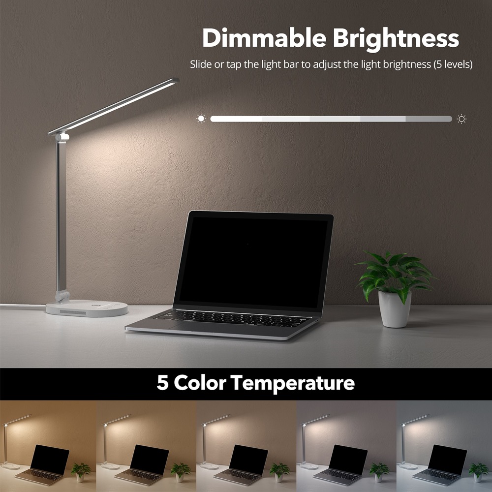 Lampa de masa TT-DL1012 are o putere de 10W. Se pot selecta 5 temperaturi de culoare si 5 niveluri de luminozitate diferite, pentru a se potrivi cel mai bine nevoilor dumneavoastra.