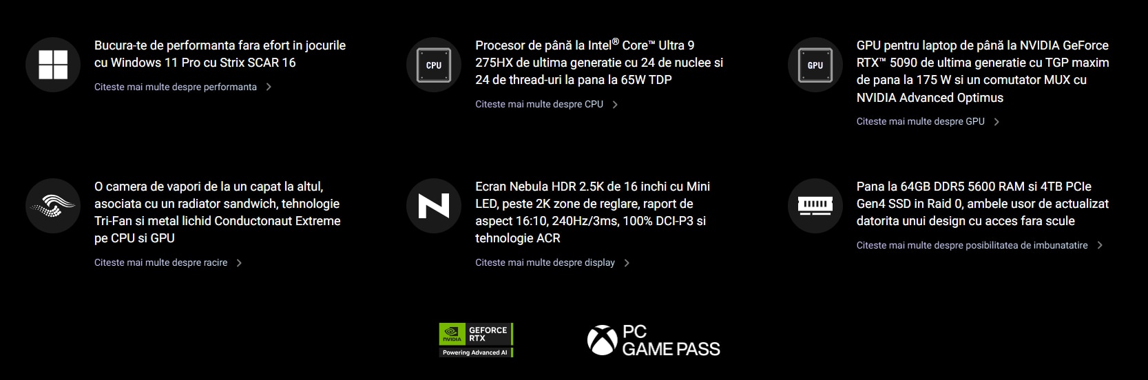 Ecranul laptopului tau este o fereastra catre lumi noi, motiv pentru care am pus cel mai bun absolut pe ROG Strix SCAR 16. Acest afisaj ROG Nebula HDR cu tehnologie Mini LED are peste 2000 de zone de dimming, 1200 nits de luminozitate maxima si culori frumoase datorita acoperirii de 100% a spatiului de culoare DCI-P3. 2025 SCAR 16 a fost, de asemenea, actualizat cu un nou strat dual ACR, care reduce reflexiile si imbunatateste contrastul de 4,5 ori pentru culori incredibil de vii. Atunci cand este combinat cu propriul nostru motor Nebula HDR, acest ecran asigura ca fiecarui joc si film i se face adevarata dreptate. si cu o rata de reimprospatare extrem de rapida de 240 Hz si suport G-SYNC complet, miscarea va fi incredibil de lina, permitandu-ti sa vezi fiecare inamic inainte ca el sa te vada pe tine.
