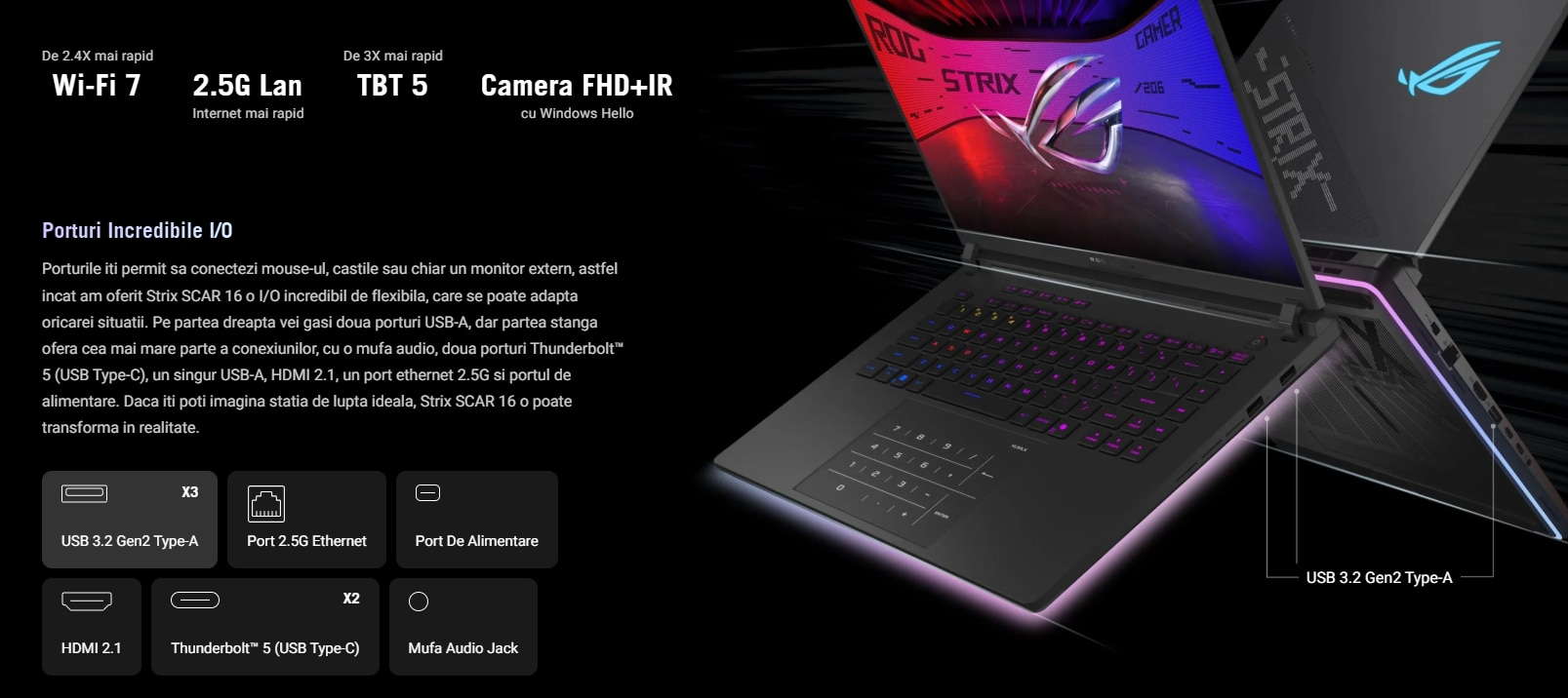 Porturile iti permit sa conectezi mouse-ul, castile sau chiar un monitor extern, astfel incat am oferit Strix SCAR 16 o I/O incredibil de flexibila, care se poate adapta oricarei situatii. Pe partea dreapta vei gasi doua porturi USB-A, dar partea stanga ofera cea mai mare parte a conexiunilor, cu o mufa audio, doua porturi Thunderbolt™ 5 (USB Type-C), un singur USB-A, HDMI 2.1, un port ethernet 2.5G si portul de alimentare. Daca iti poti imagina statia de lupta ideala, Strix SCAR 16 o poate transforma in realitate.