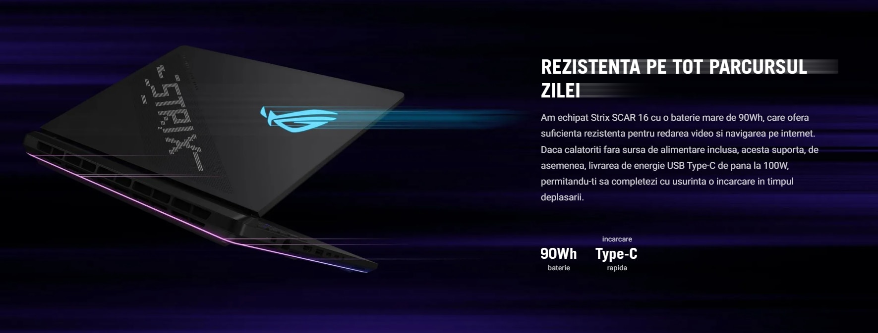 Performanta necesita putere, asa ca am pornit SCAR 16 la maxim. in modul Turbo, puterea maxima este de 55 W pentru CPU si de 175 W pentru GPU. Pentru cei care doresc sa se joace in modul Manual, au acces la inca 10W pentru CPU, pentru o putere maxima totala a sistemului de 240W. Indiferent ce fel de jucator esti, puterea bruta a Strix SCAR 16 iti va oferi un avantaj fata de adversarii tai.